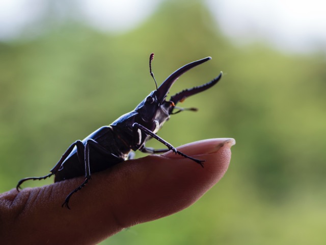 しばらくすると、クワガタくんはまた自分の道へと歩き出し、橿原神宮の森のほうへと帰っていった。