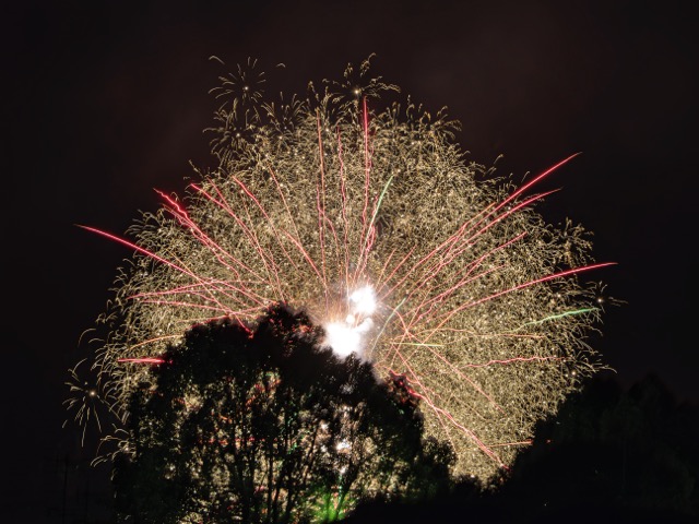 最後の大玉が、樹木の向こうでぱっと開いた瞬間、あたりの空気まできらきらして見えた。終わってしまえば、またいつもの静かな夜。けれど、ほんの少し、心に火がともった気がする。