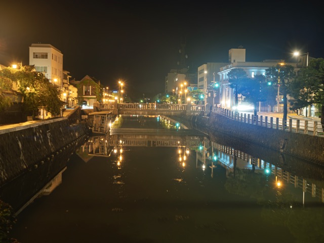 城下を囲む堀川沿いを歩けば、川面に映る灯りが揺らめき、まるで水の底にもうひとつの町があるようだ。江戸時代、この水路は物資輸送の大動脈で、米俵や材木を積んだ船が行き来していたという。今は遊覧船が昼の観光客を乗せるだけだが、夜になると水音だけが静かに残り、時代の境目が曖昧になる。