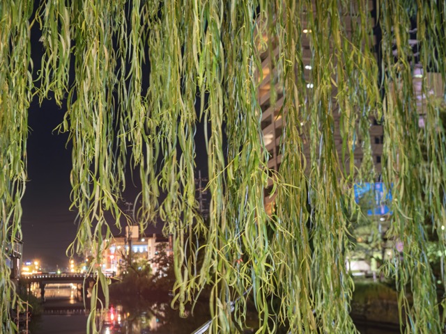 橋のたもとで、柳の枝が長く垂れ下がっている。その向こうに見える灯りが、葉の隙間から水面へこぼれ落ちていく。柳は昔から城下町の風物詩で、夏の涼しさと同時に、幽玄な空気も漂わせる。松江には小泉八雲の怪談をテーマにした「ゴーストツアー」があると聞くが、この景色の中ではそれも自然なことのように思えてくる。柳が風に揺れるたび、どこからか見えない客人が現れそうな気配がした。